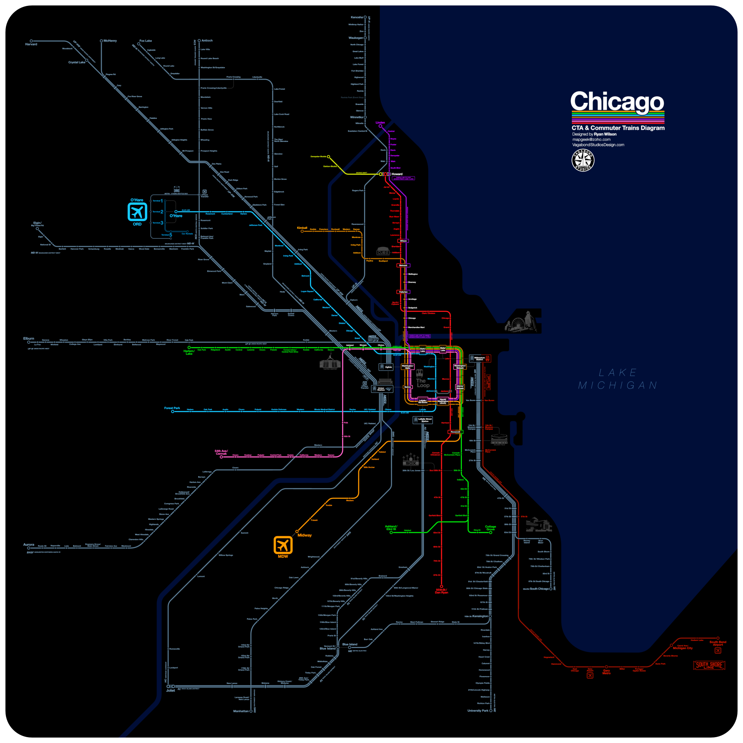 This (Unofficial) Map Design was created to combine and simplify all of the various train routes in the greater Chicago area including The EL, Metra, & South Shore Line. The diagram is streamlined to focus on urban rail exploration in the city and beyond, and how to navigate connections between the various hubs, routes, and operators.